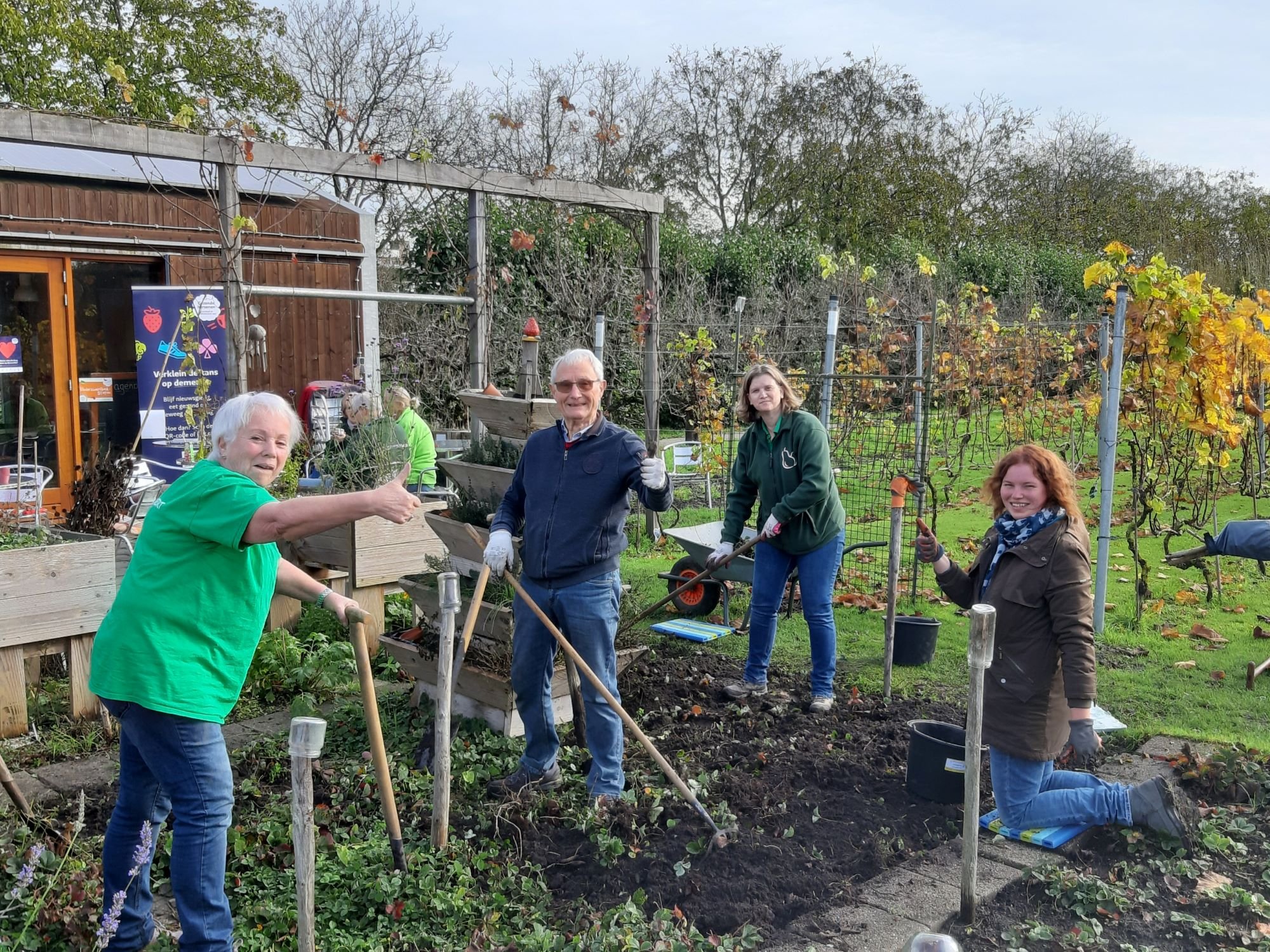 Het resultaat: scheve bomen zijn recht gezet, de bodem is gevoed met kalk om zo de voedingstoffen uit de klei beschikbaar te maken voor de bomen, de moestuin is opgeruimd en bemest, het kippenhok heeft nieuw zand, de Tiny forest is weer een heerlijke plek en weer begaanbaar voor kinderen en de bijentuin ligt er weer prachtig bij.